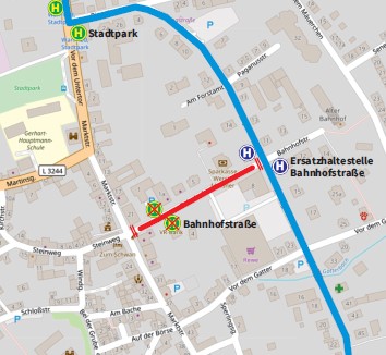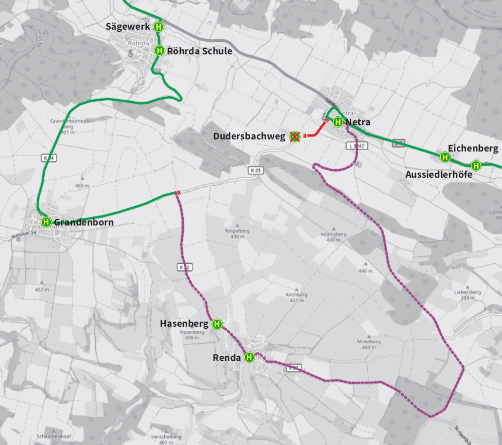 Haltestelle "Fuldabrück-Dörnhagen Mitte" entfällt. Die Haltestelle "Fuldabrück-Dörnhagen Rathaus" wird in den Glockenhofsweg verlegt.
